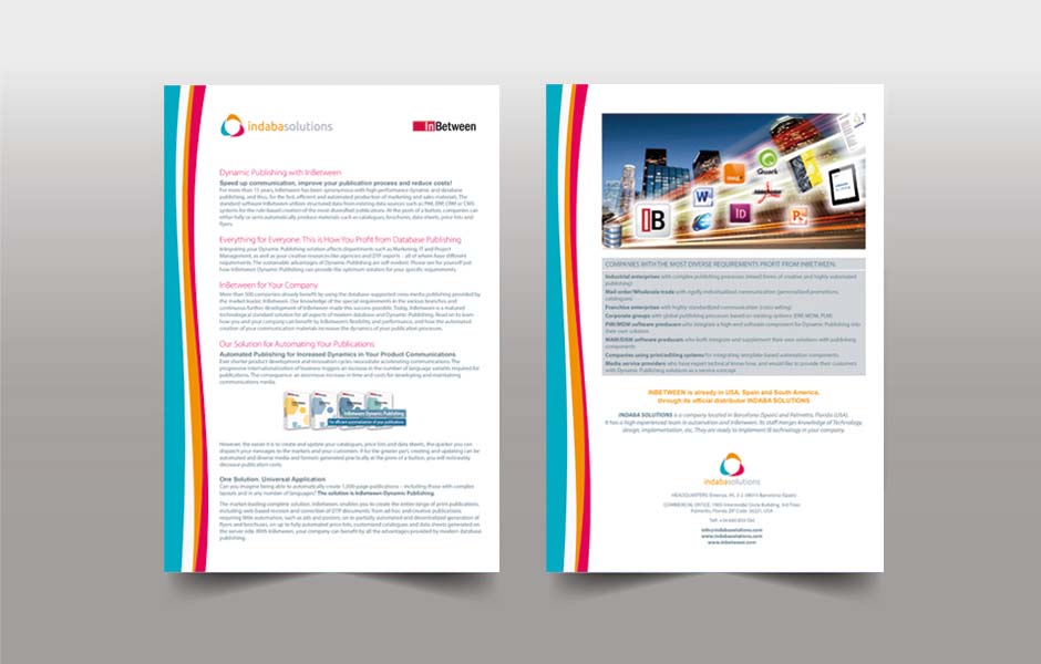 Flyer Corporativo Indaba Solutions Flyer de presentación de empresa. Categoria: Comunicación gráfica Sector: Empresa de servicios tecnológicos e-commerce y automatización de publicaciones
