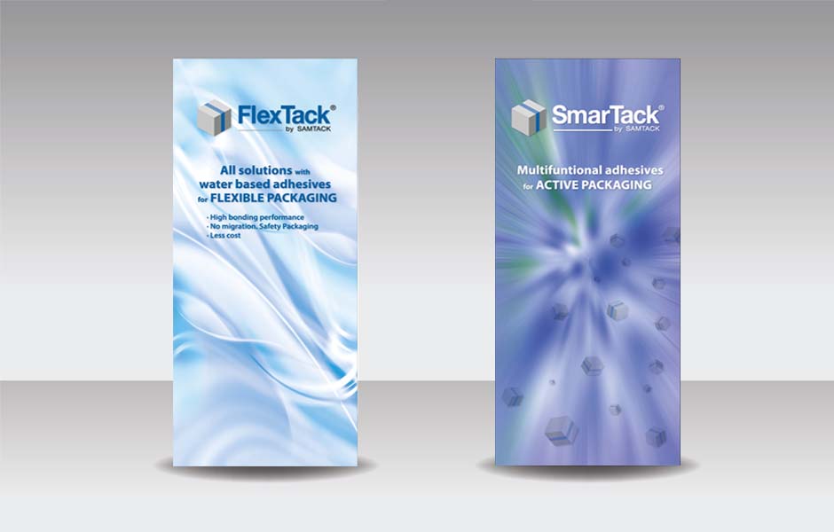 Rollup Samtack (Flextack i SmarTack) Roll Ups de presentación de productos para stands. Categoria: Comunicación gráfica Sector: Colas industriales adhesivos selladores y barnices