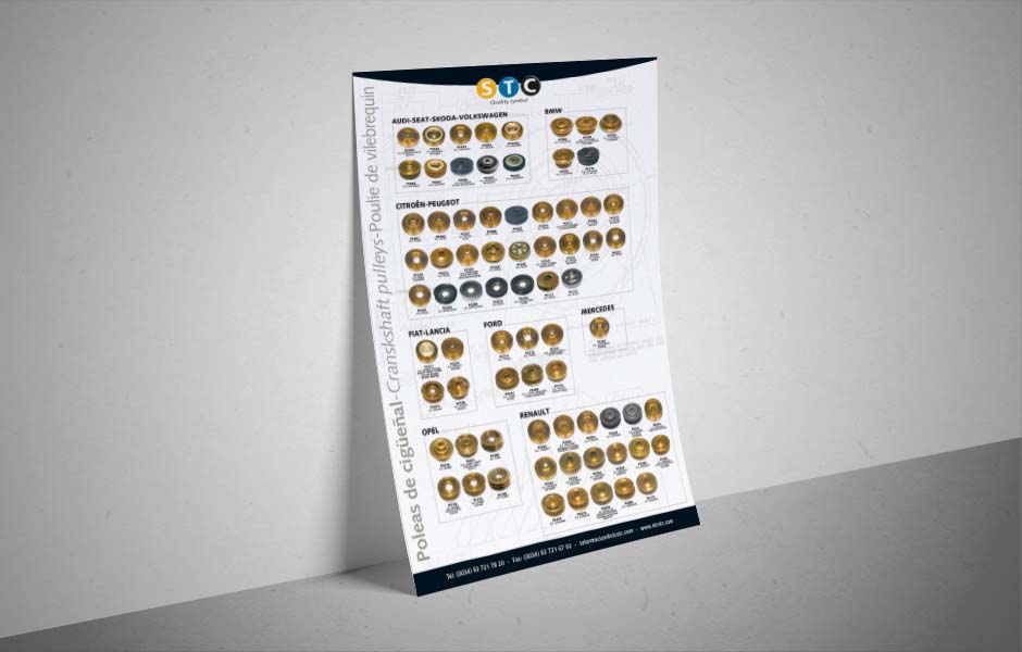 Cartel STC (Servicio y Tecnología del Caucho) Cartel específico sobre Poleas de cigüeñal. Categoria: Comunicación gráfica Sector: Piezas de repuesto y accesorios de goma y metal para automóvil