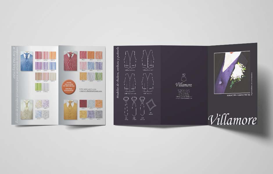 Tríptico Ceremonia Manufacturas Villamore Tríptico sobre productos de ceremonia. Categoria: Comunicación gráfica Sector: Complementos del vestir masculino en líneas de corbatería y ceremonia