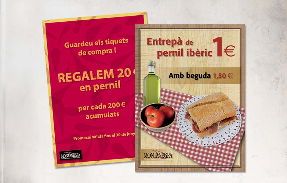 Carteles MONTANEGRA Carteles para las tiendas de la marca de ofertas y productos promocionales. Categoria: Comunicación gráfica Sector: Jamones