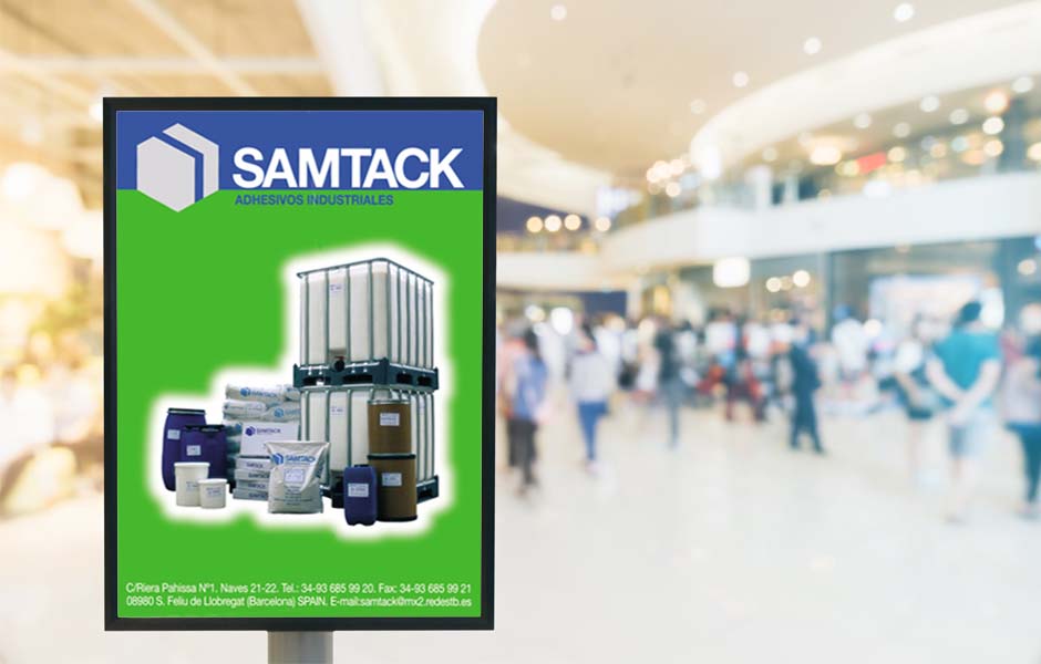 Cartel Samtack Cartel de presentación de producto para stand. Categoria: Comunicación gráfica Sector: Colas industriales adhesivos selladores y barnices